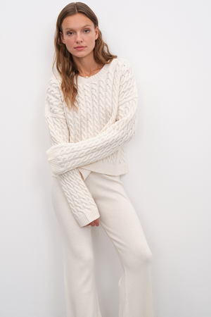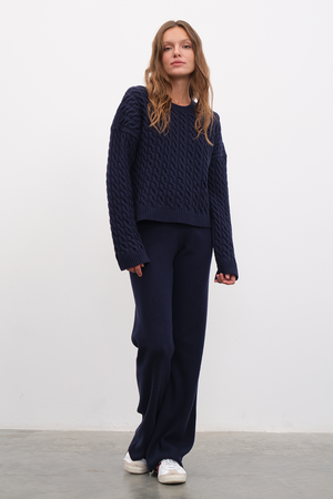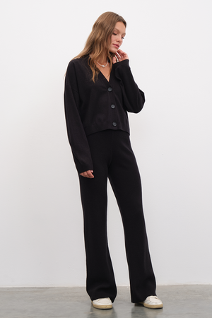 Ekolojik olarak sürdürülebilir, yumuşak dokulu, hipoalerjenik, lüks İtalyan extra-fine merino yününden örülen, ince ribana örgülü, beli lastikli, dizden itibaren bollaşarak inen triko pantolon.
