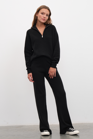 Ana görseldeki ince ribanalı merino triko pantolon, yarım fermuarlı unisex merino triko ile tamamlanmıştır.