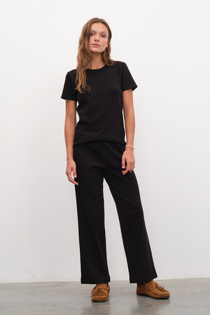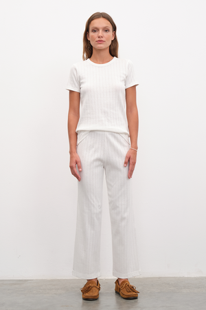 Ana görseldeki pointelle cotton crop flare pantolon, pointelle cotton bisiklet yakalı t-shirt ve pointelle cotton bisiklet yakalı uzun kollu t-shirt ile tamamlanmıştır.