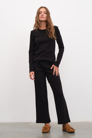 İkonik Amerikan örgü deseni olan 'Pointelle'in sade ve modern çizgimizle buluştuğu; sweatshirt, triko, t-shirt veya kendi üstleriyle beraber giymek üzere tasarladığımız, hem sportif, hem de feminen bir duruşa sahip, beli ince lastikli, crop flare pantolon.