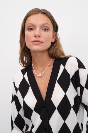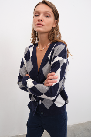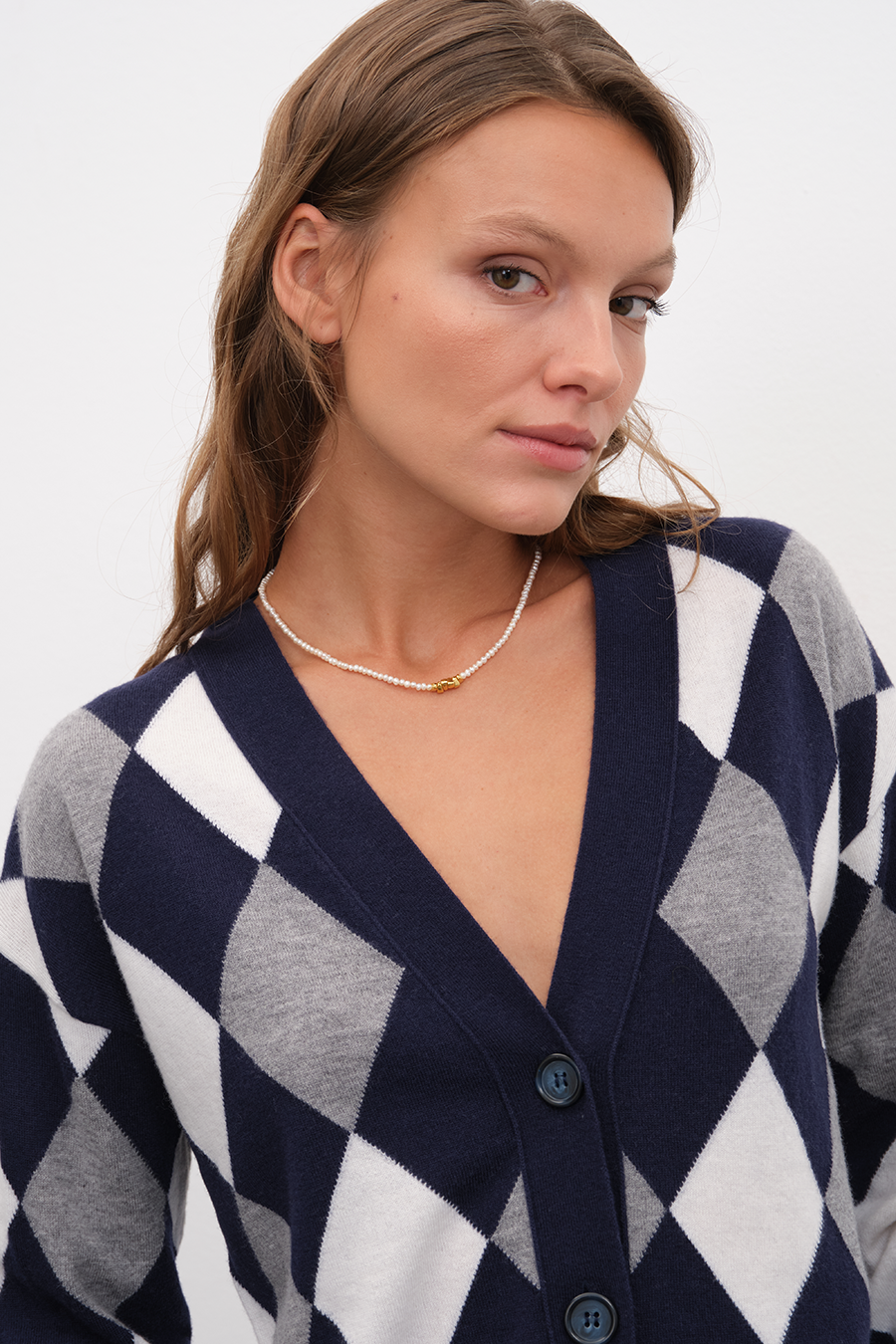 Ekolojik olarak sürdürülebilir, yumuşak dokulu, hipoalerjenik, lüks İtalyan extra-fine merino yününden örülen, baklava desenli hırka.