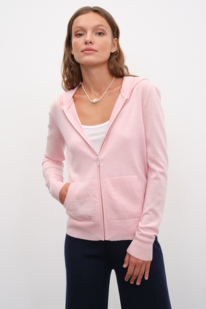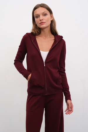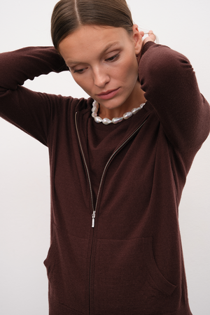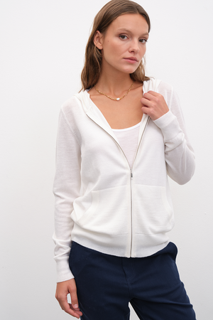 Ekolojik olarak sürdürülebilir, yumuşak dokulu, pürüzsüz yüzeyli, hipoalerjenik, lüks İtalyan extra-fine merino yününden örülen, fermuarlı, kapüşonlu, fit kalıplı, lightweight triko.