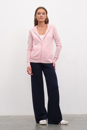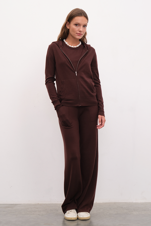 Ana görseldeki fermuarlı lightweight merino fitted hoodie,bol paçalı lightweight merino triko pantolon ile tamamlanmıştır.