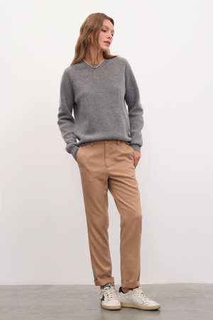 Ana görseldeki ribanalı cashmere merino triko, TENCEL™ chino pantolon ve ipek saten pantolon ile tamamlanmıştır.