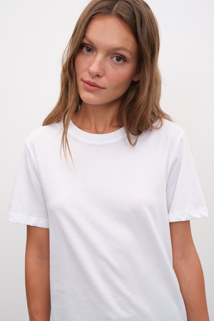 Beyaz t-shirt görselindeki modelin boyu: 1.70 cm - kilo: 49 kg - beden: 34 - ürün bedeni: xs