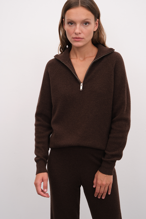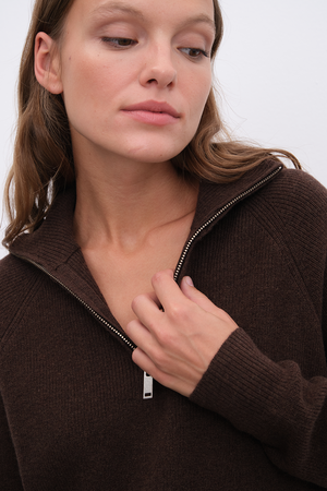 Ekolojik olarak sürdürülebilir, yumuşak dokulu, hipoalerjenik, lüks İtalyan extra-fine merino yününden örülen, selanik örgülü, reglan kollu, yarım fermuarlı unisex triko.