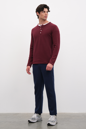 Ana görseldeki TENCEL™ chino pantolon, yarım fermuarlı unisex merino triko ile tamamlanmıştır.