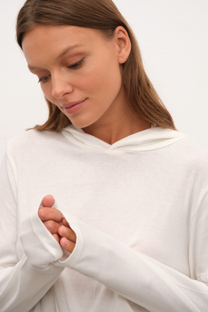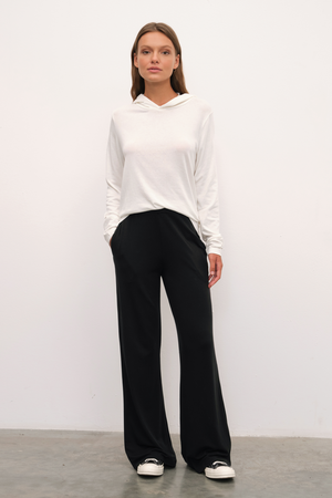 Yumuşak tuşeli ve dökümlü pamuk-viskon karışımı kumaşımızdan ürettiğimiz, kapüşonlu lightweight unisex sweatshirt.
