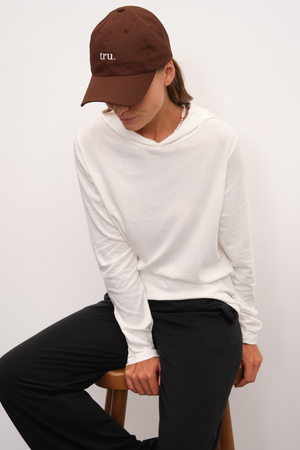 Ana görseldeki super-lightweight unisex hoodie, 'live-in' bol paçalı krep TENCEL™ pantolon ve unisex şapka ile tamamlanmıştır.