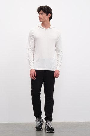 Ana görseldeki super-lightweight unisex hoodie, pull-on chino pantolon ile tamamlanmıştır.
