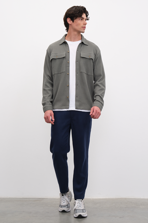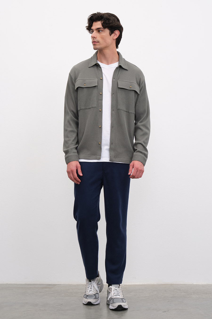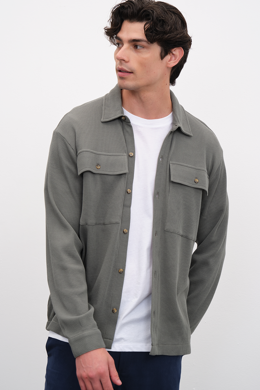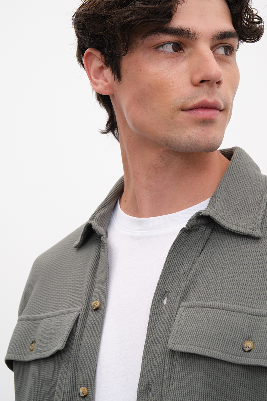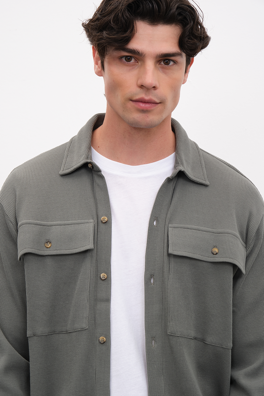 Signature waffle örgülü pamuklu kumaşımızdan, serin sonbahar aylarınızın tamamlayıcısı, düğmeli, cepli gömlek/ceket.