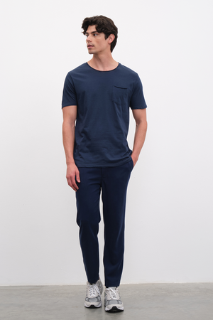 Lightweight cotton kumaştan üretilen, kesik yaka ve kol bitişli, bisiklet yakalı ve cepli t-shirt.