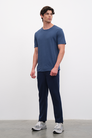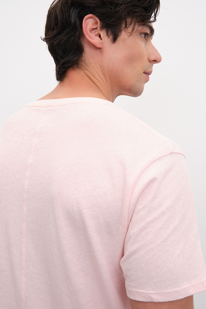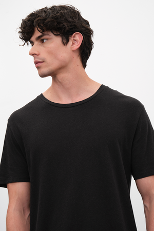 Kendi geliştirdiğimiz keten-cotton karışımlı kumaşımızdan, sırt dikiş detaylı, bisiklet yakalı, unisex t-shirt.