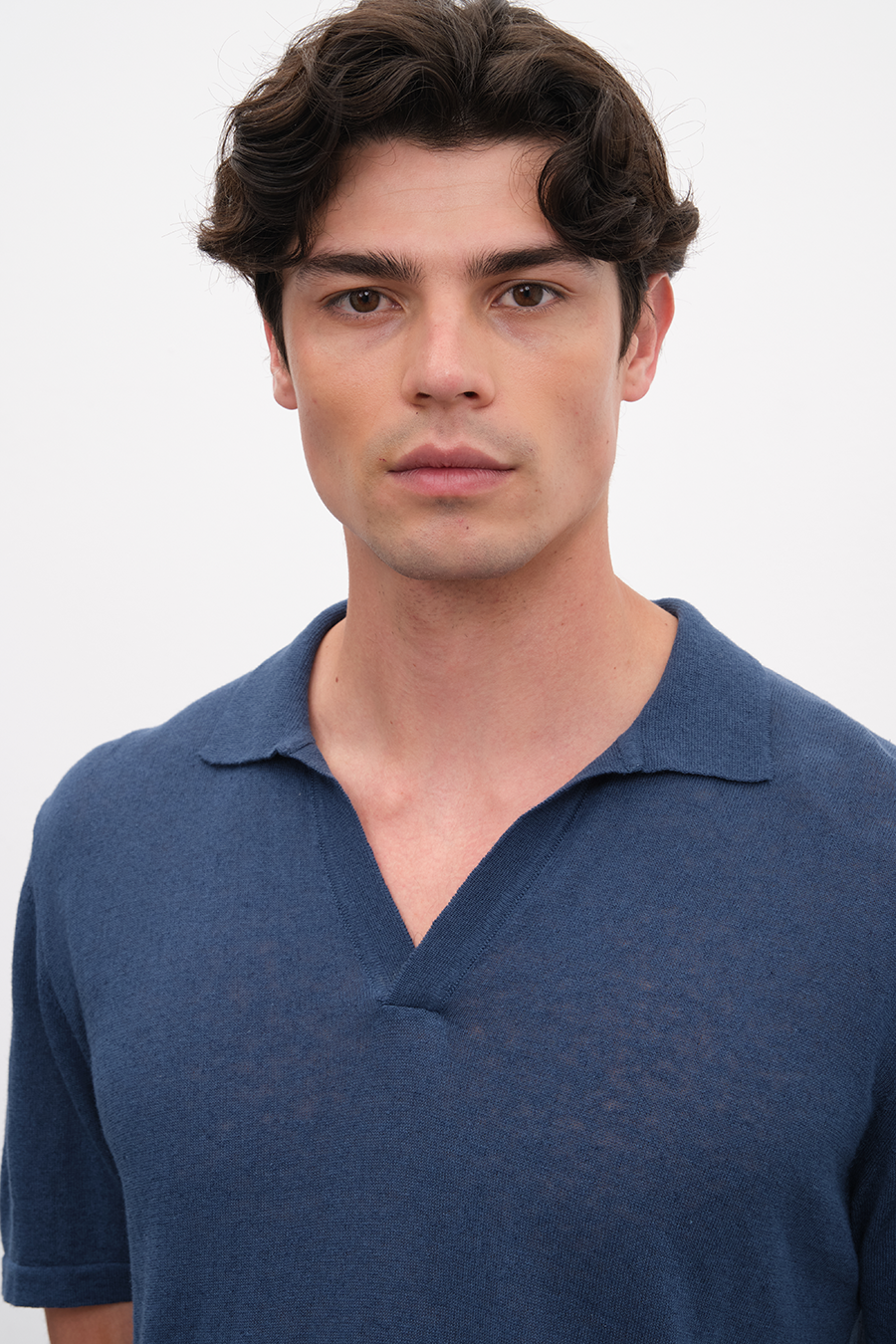 Pamuk-keten karışımı iplikten örülen, polo yakalı, kısa kollu lightweight triko t-shirt.