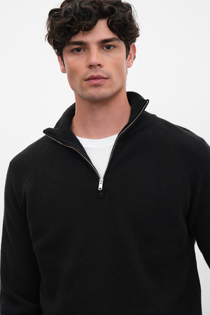 Ekolojik olarak sürdürülebilir, yumuşak dokulu, hipoalerjenik, lüks İtalyan extra-fine merino yününden örülen, selanik örgülü, reglan kollu, yarı fermuarlı unisex triko.
