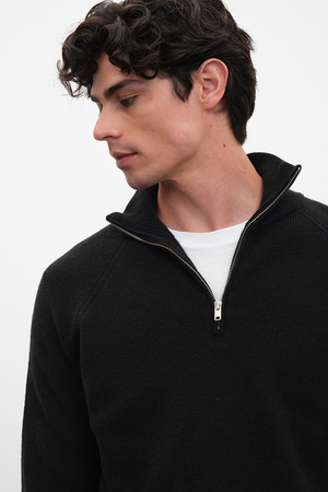 Ana görseldeki yarım fermuarlı unisex merino triko, pull-on yün kumaş pantolon ile tamamlanmıştır.