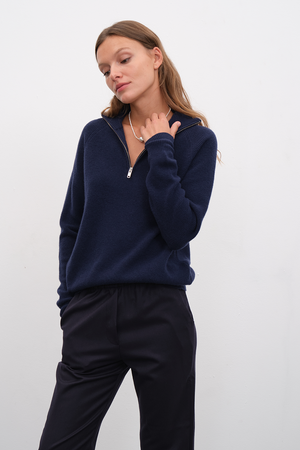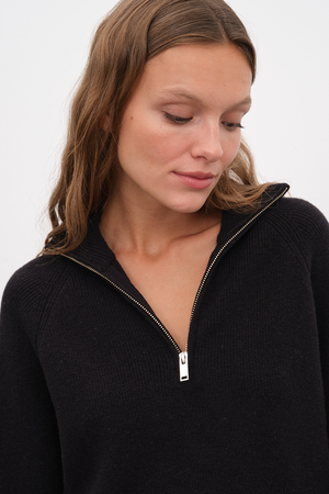 Ekolojik olarak sürdürülebilir, yumuşak dokulu, hipoalerjenik, lüks İtalyan extra-fine merino yününden örülen, selanik örgülü, reglan kollu, yarı fermuarlı unisex triko.