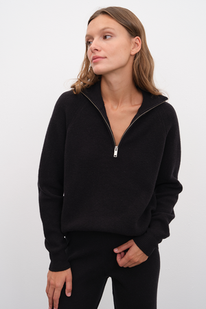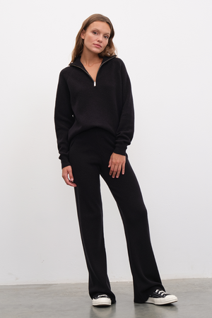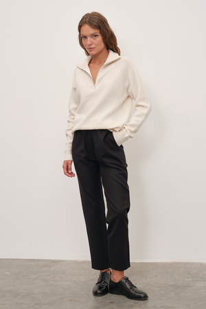 Ana görseldeki yarım fermuarlı unisex merino triko, pull-on yün kumaş pantolon ile tamamlanmıştır.
