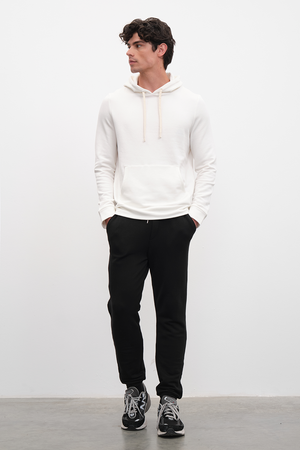 Ana görseldeki modal fleece jogger eşofman altı, super-soft modal fleece fermuarlı unisex hoodie ve unisex crispy cotton t-shirt ile tamamlanmıştır.