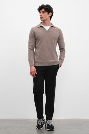 Ana görseldeki pull-on TENCEL™ chino pantolon, yarım fermuarlı unisex merino triko ile tamamlanmıştır.