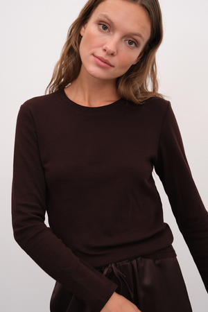 Ana görseldeki everyday cotton uzun kollu fitted t-shirt, ipek saten pantolon ile tamamlanmıştır.