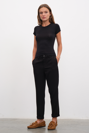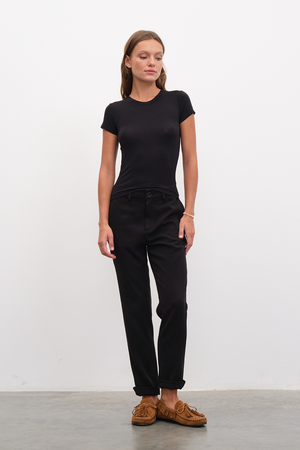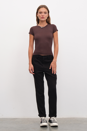 Kendi geliştirdiğimiz yumuşak tuşeli ve esnek yapılı, micro-modal içerikli, en ince kumaşımızdan, 90ların dar ve vücudu saran "baby tee"lerinden esinlenerek koleksiyona uyarladığımız, kısa kollu, form-fitting t-shirt.