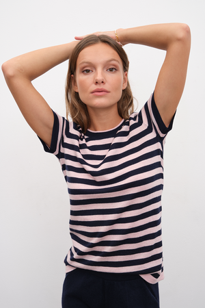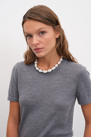 Ekolojik olarak sürdürülebilir, yumuşak dokulu, pürüzsüz yüzeyli, hipoalerjenik, lüks İtalyan extra-fine merino yününden örülen, kısa kollu, bisiklet yakalı lightweight triko t-shirt.