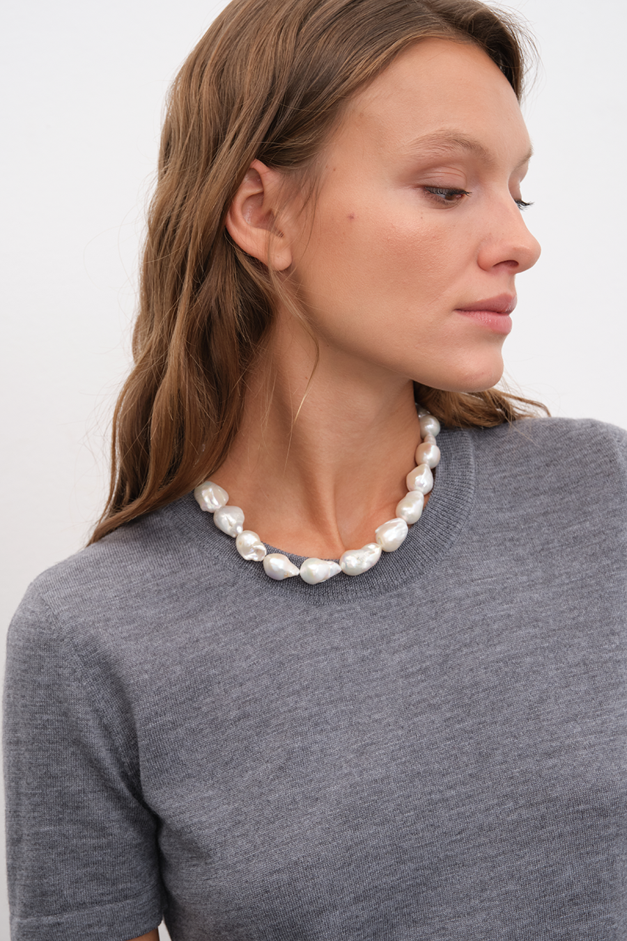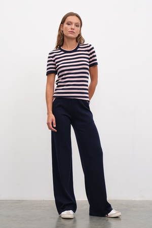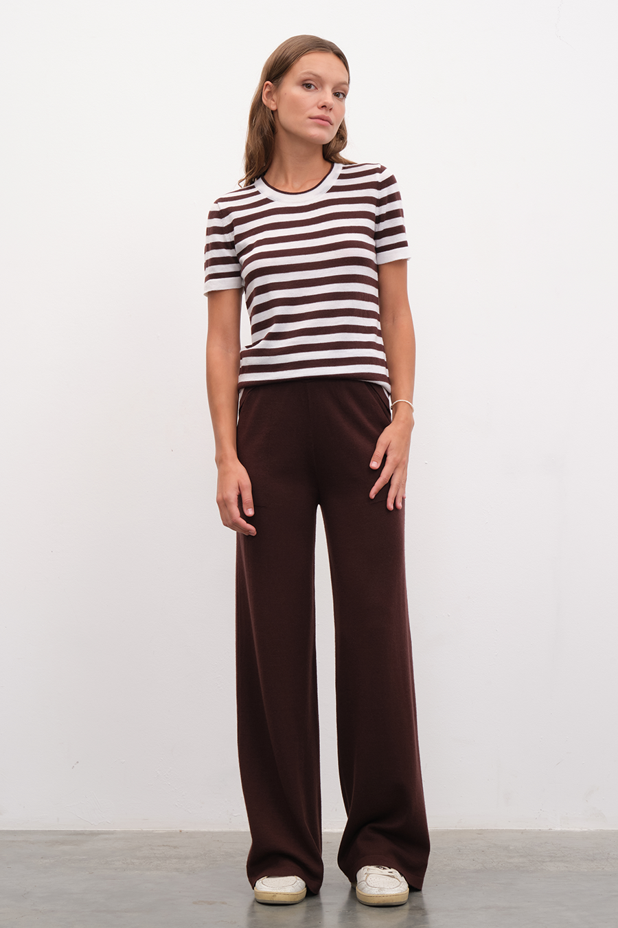 Ana görseldeki lightweight merino triko t-shirt, bol paçalı lightweight merino triko pantolon ile tamamlanmıştır.