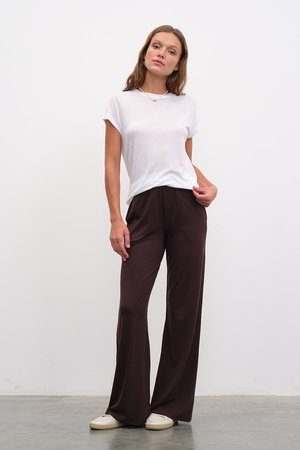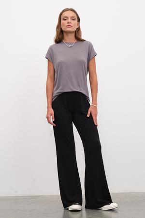Ana görseldeki 'live-in' bol paçalı krep TENCEL™ pantolon, yarasa kollu TENCEL™lyocell t-shirt ile tamamlanmıştır.