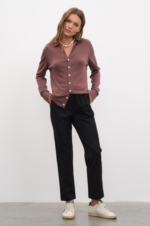 Ana görseldeki pull-on yün kumaş pantolon, yarım fermuarlı unisex merino triko ile tamamlanmıştır.