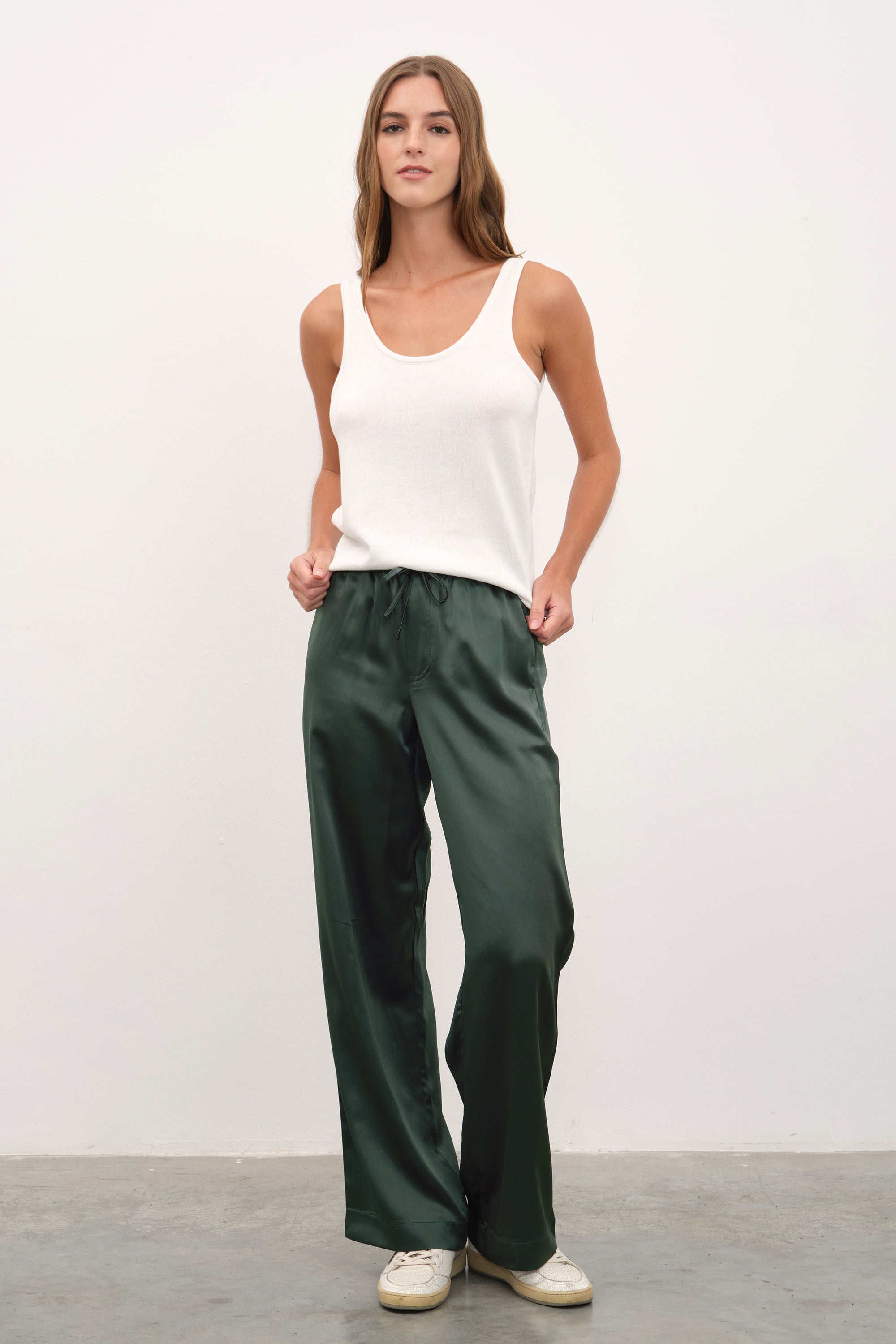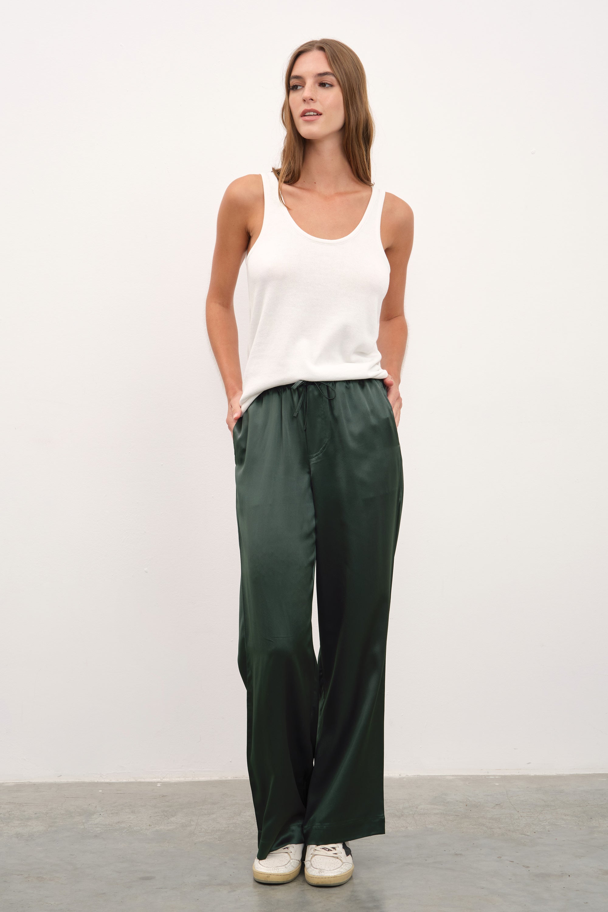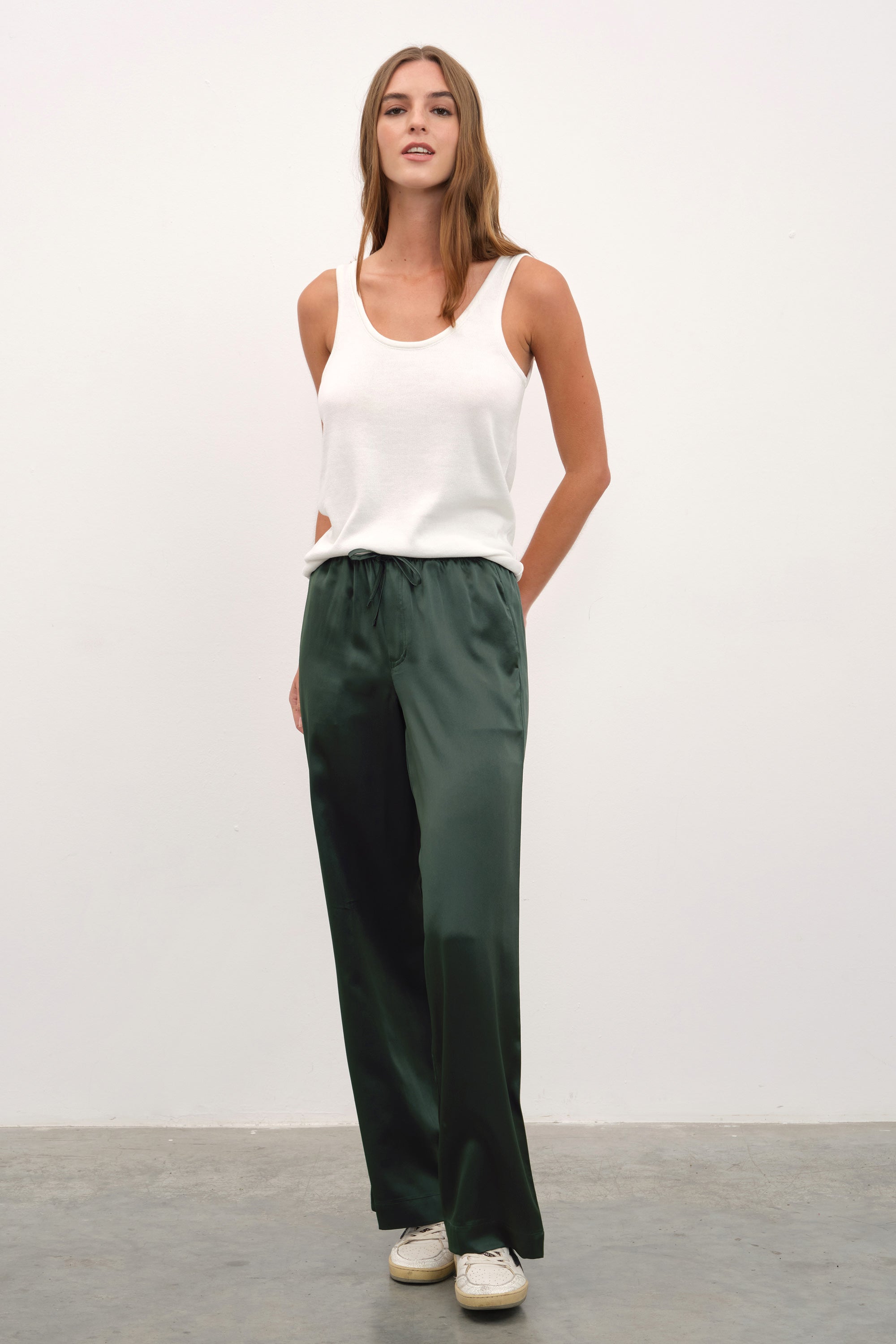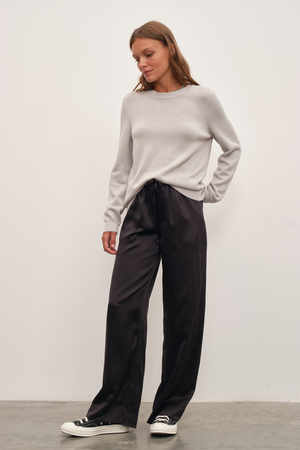 Ana görseldeki ipek saten bol paçalı pantolon, featherweight modal form-fitting uzun kollu t-shirt ile tamamlanmıştır.