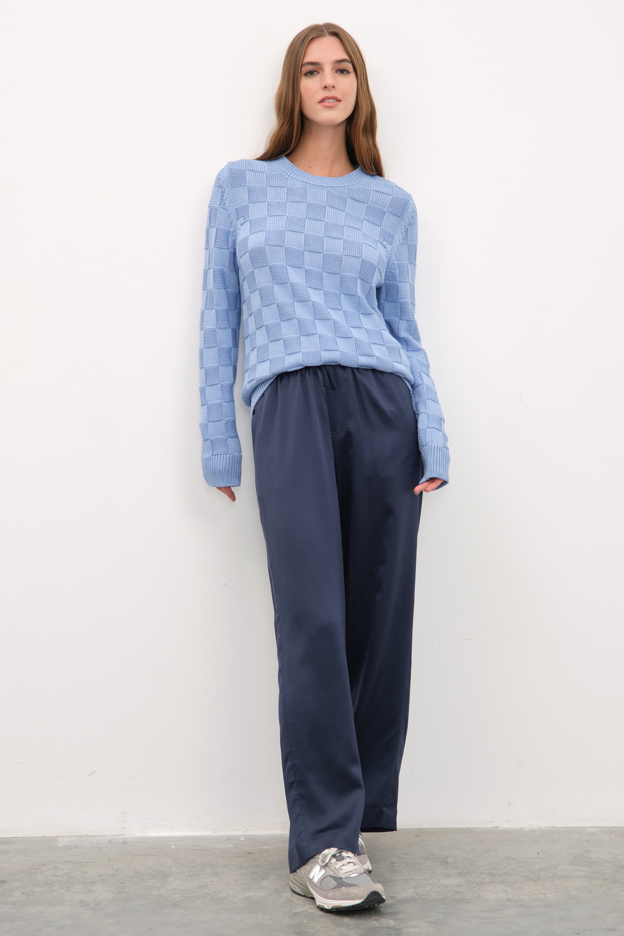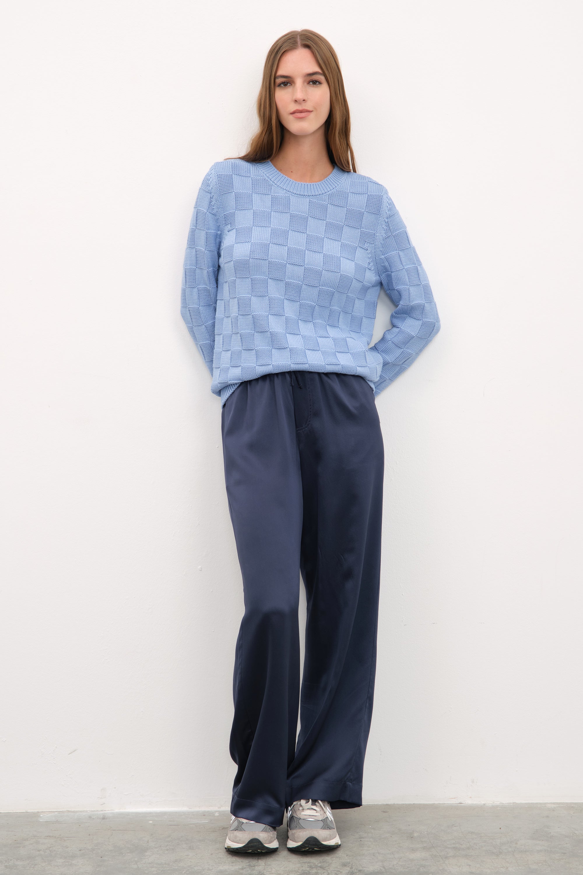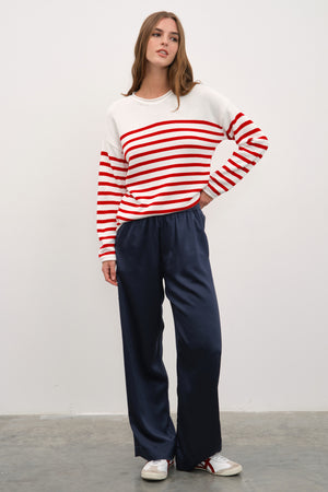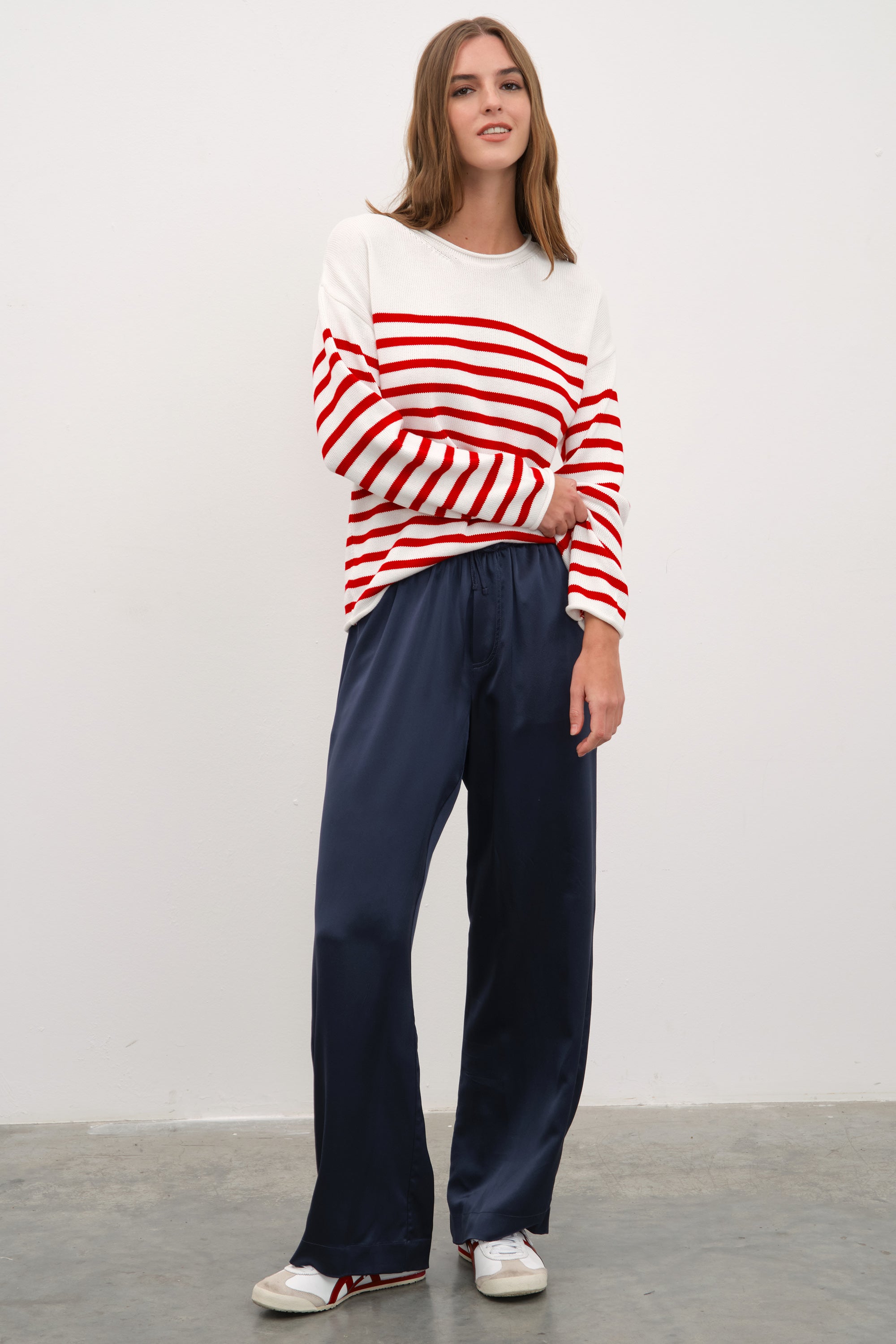 Ana görseldeki ipek saten bol paçalı pantolon, featherweight modal form-fitting uzun kollu t-shirt ile tamamlanmıştır.