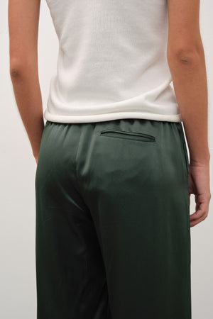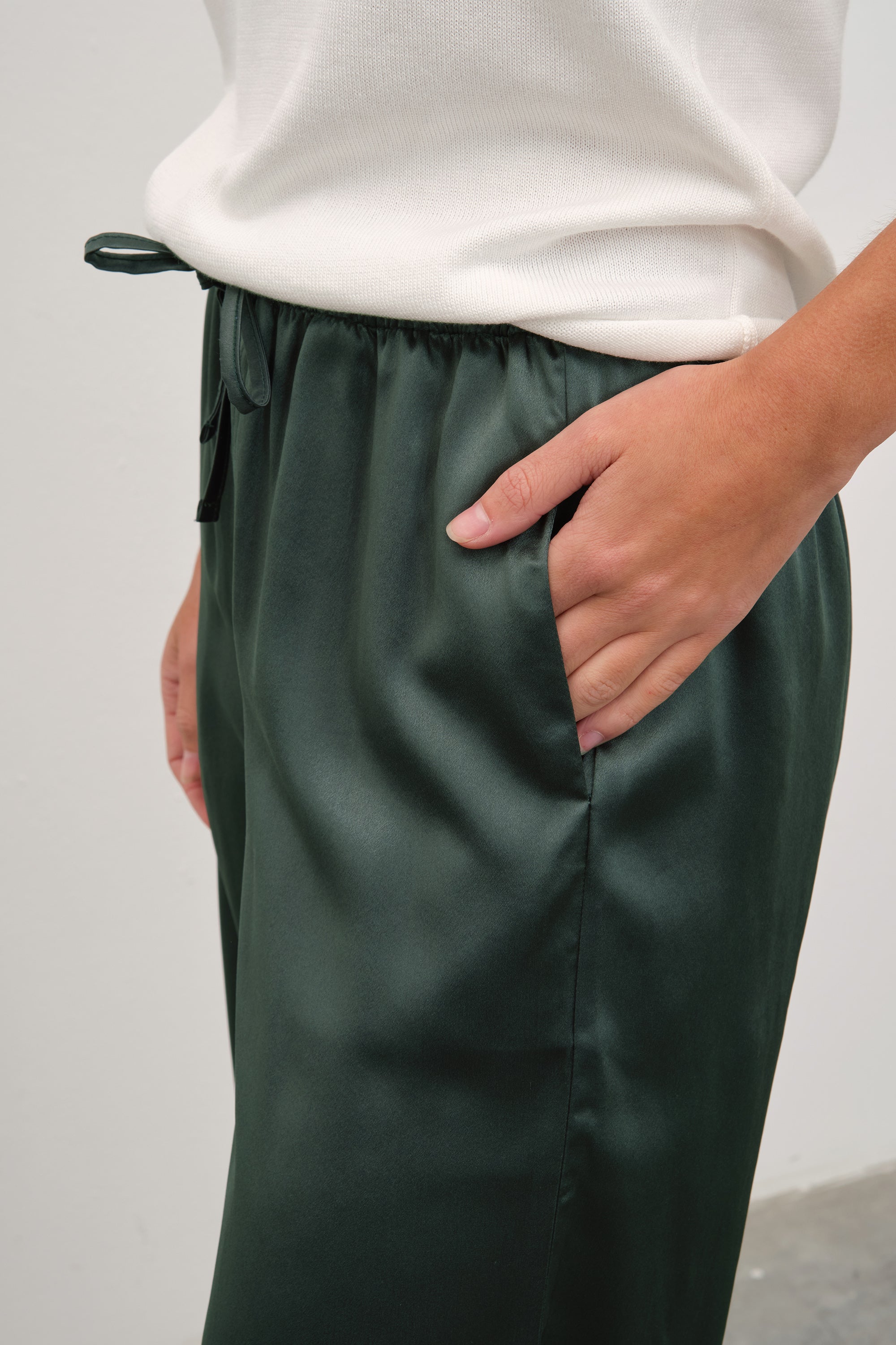 Zamansız ve lüks, tru. yorumuyla modernleşen bir klasik. %100 ipek saten kumaşımızdan, beli ince lastikli ve ipek kordon bağlamalı, cepli, bol paçalı, rahat kesim pantolon.
