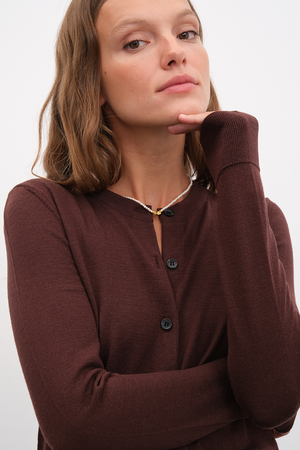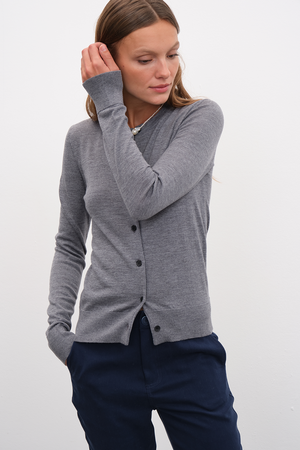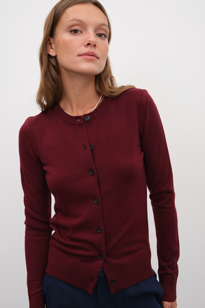 Ekolojik olarak sürdürülebilir, yumuşak dokulu, pürüzsüz yüzeyli, hipoalerjenik, lüks İtalyan extra-fine merino yününden örülen, fit kalıplı, bisiklet yakalı hırka.