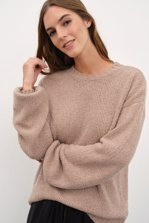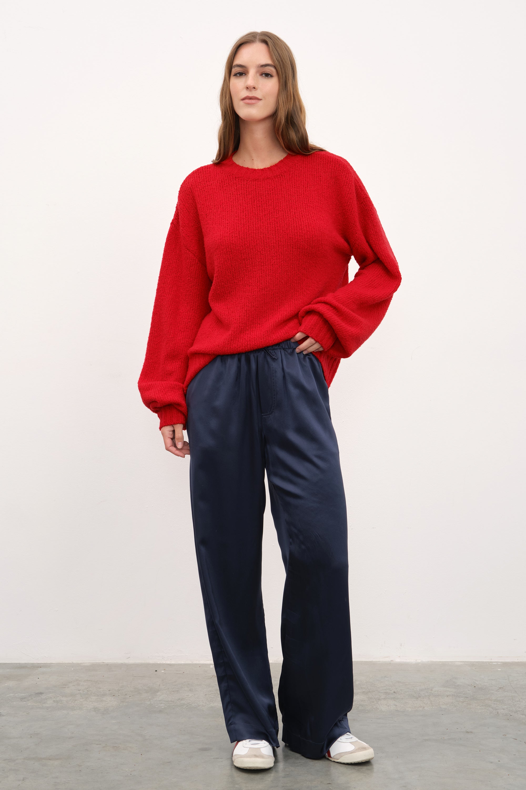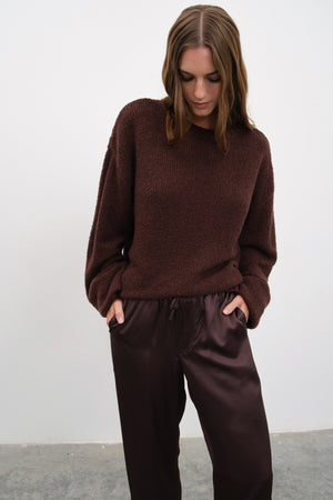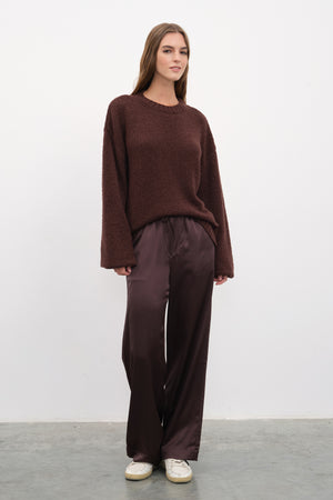 Ana görseldeki teddy merino triko, ipek saten pantolon ile tamamlanmıştır.
