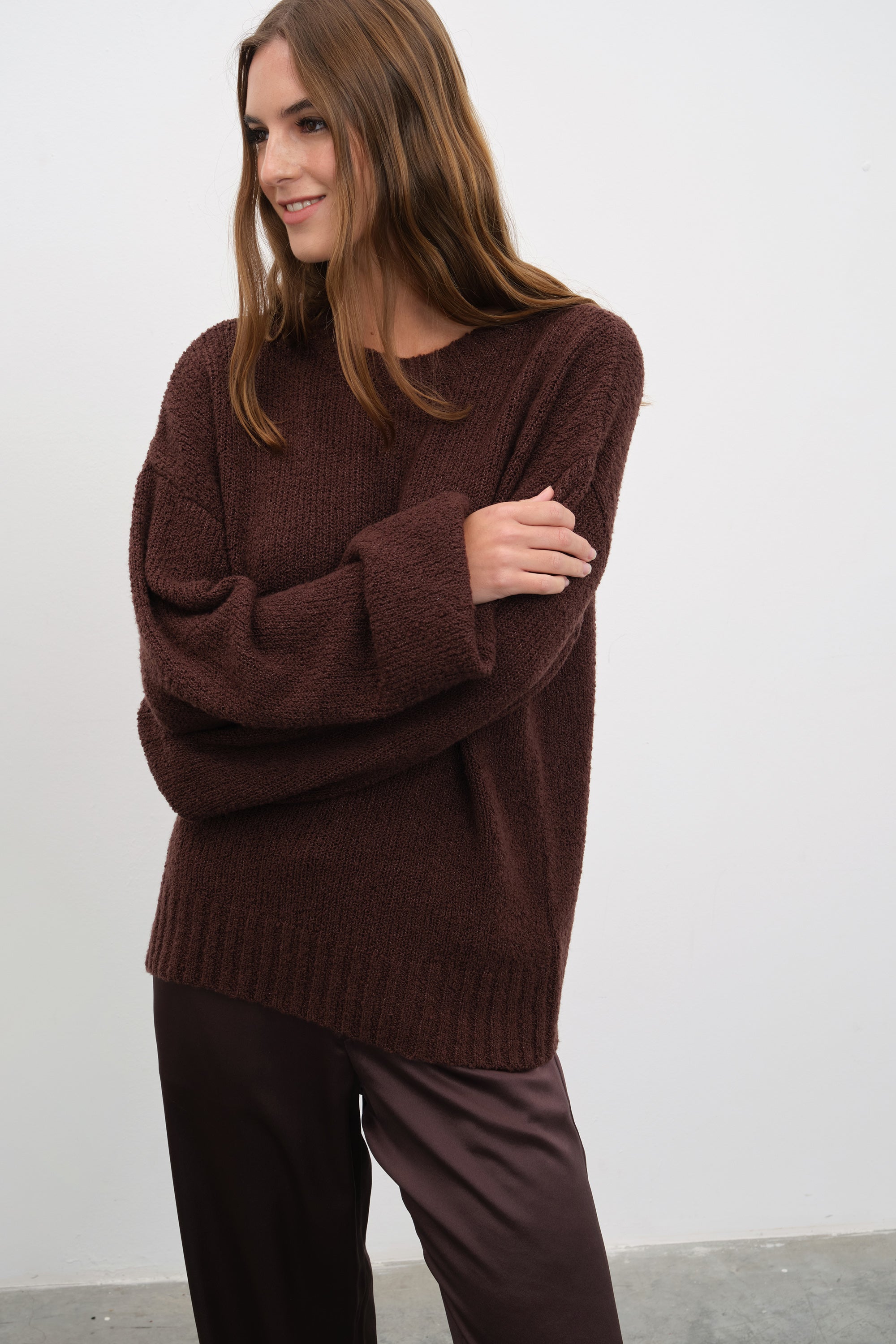 Kahve triko görselindeki modelin boyu: 1.75 cm - kilo: 55 kg - beden: 36 - ürün bedeni: s/m