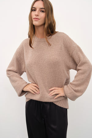 Ekolojik olarak sürdürülebilir, süper-hafif, süper-yumuşak, hipoalerjenik, lüks İtalyan ultra-fine merino ve ipek karışımı yününden örülen, düşük omuzlu, bisiklet yakalı triko.