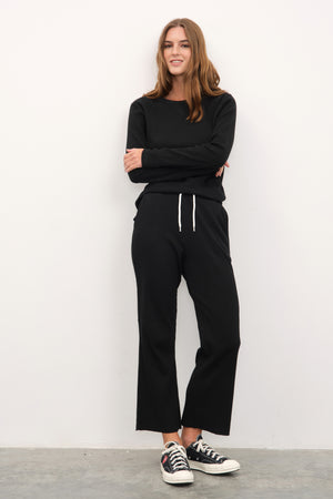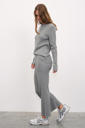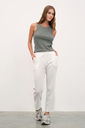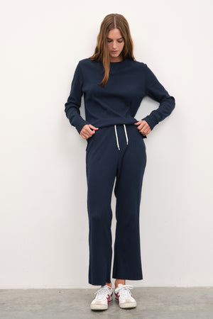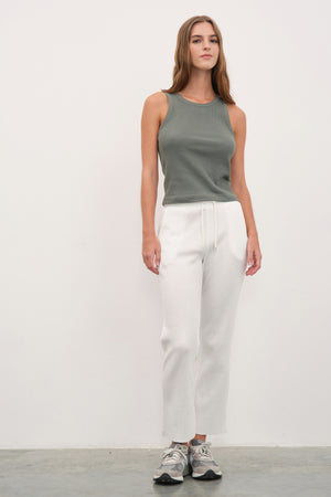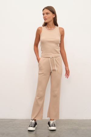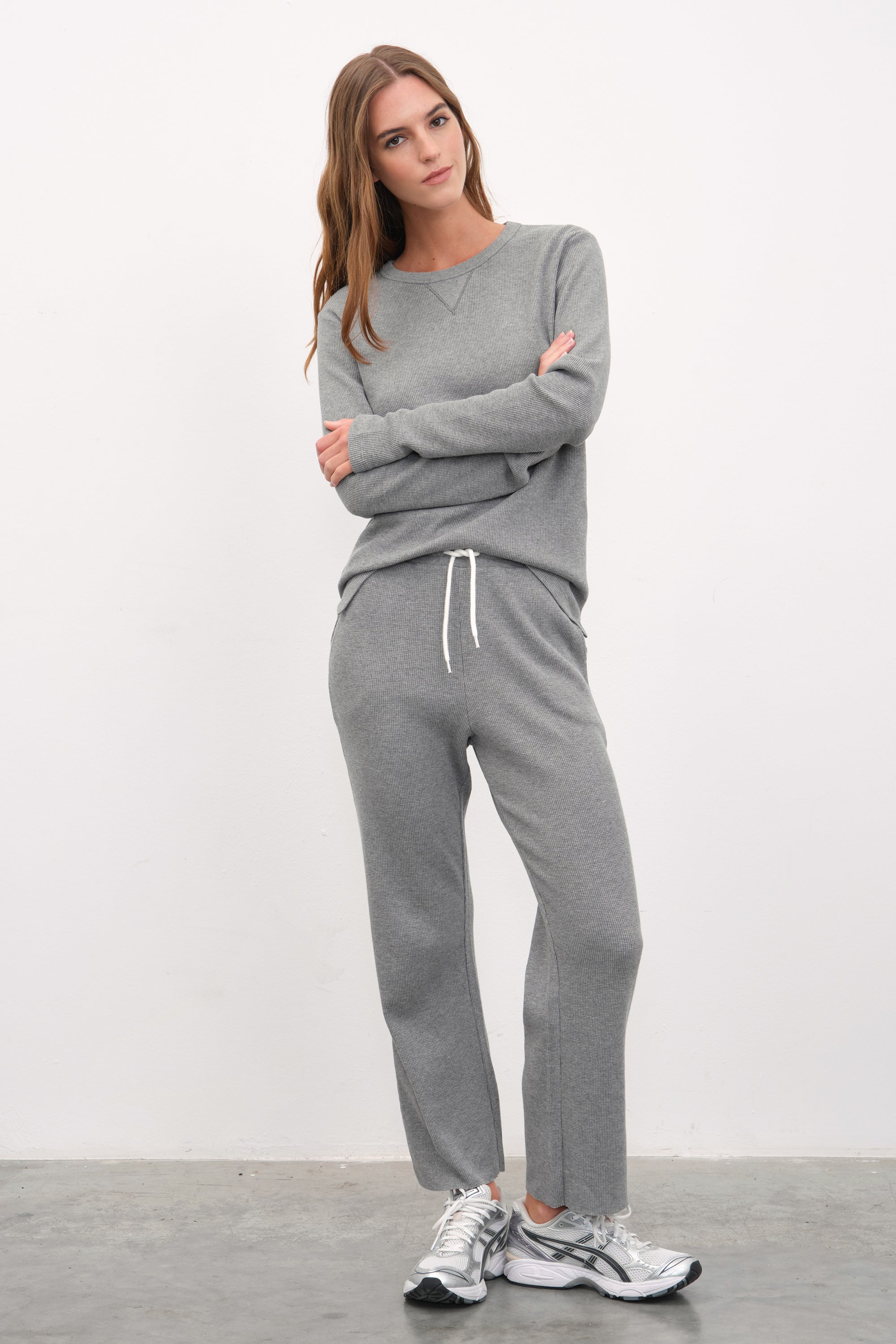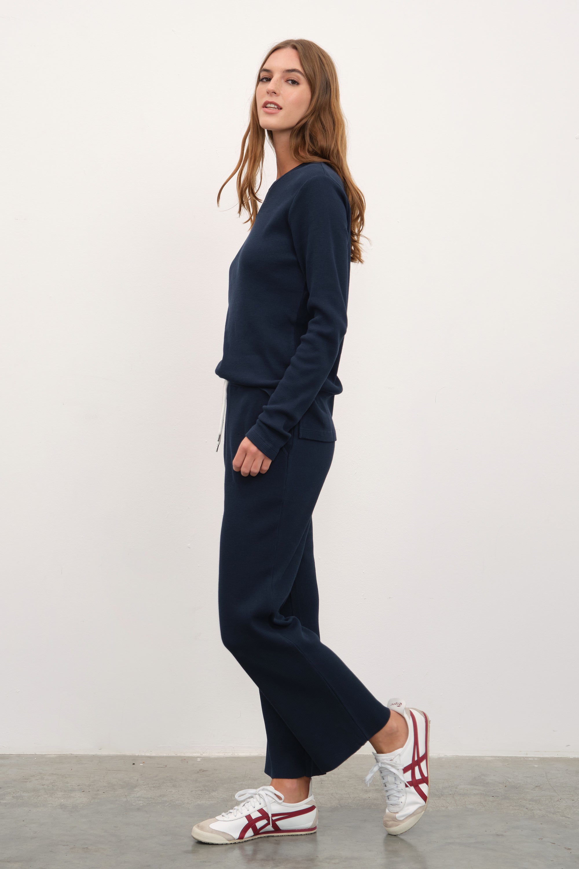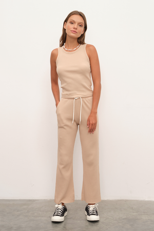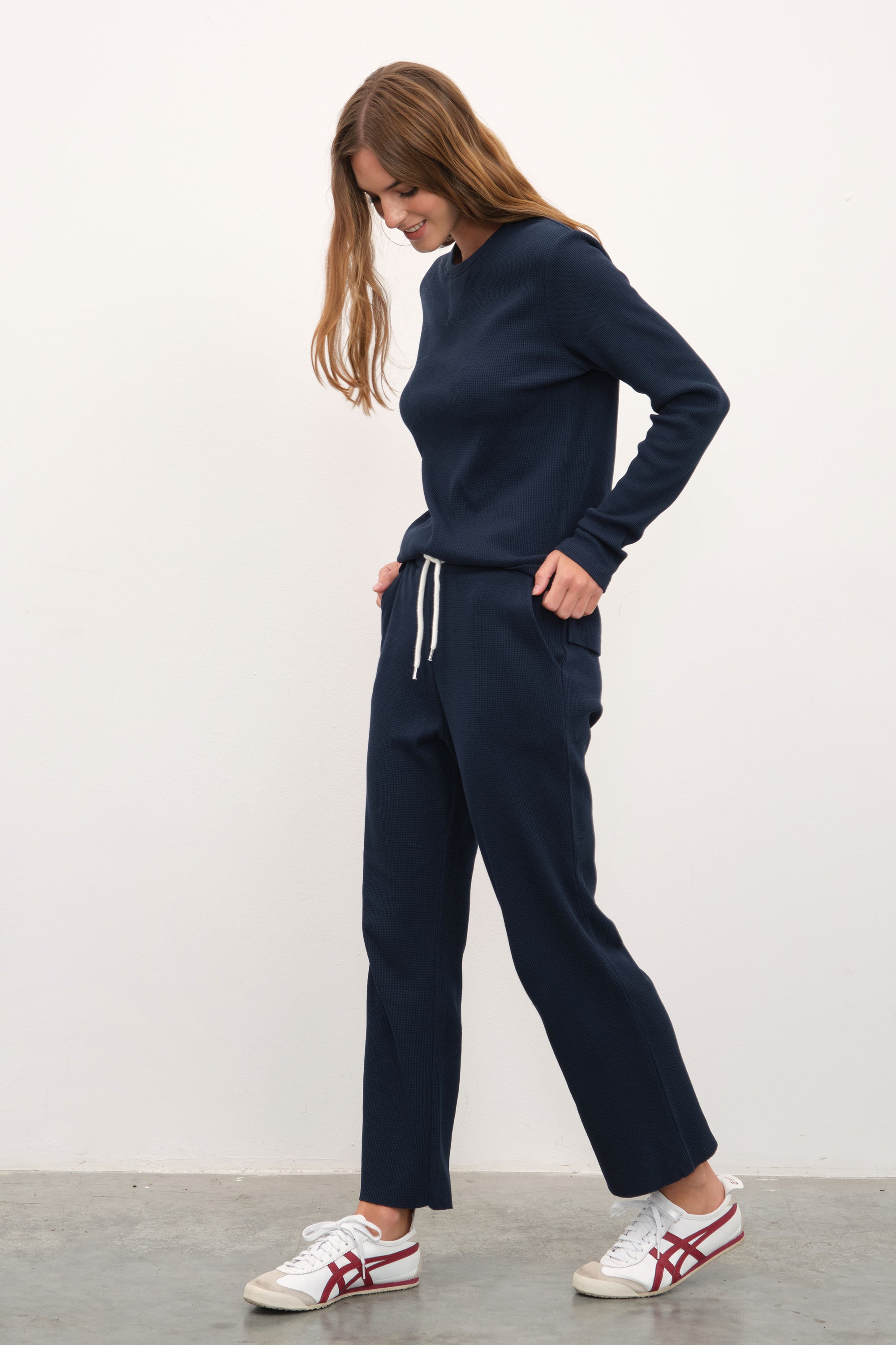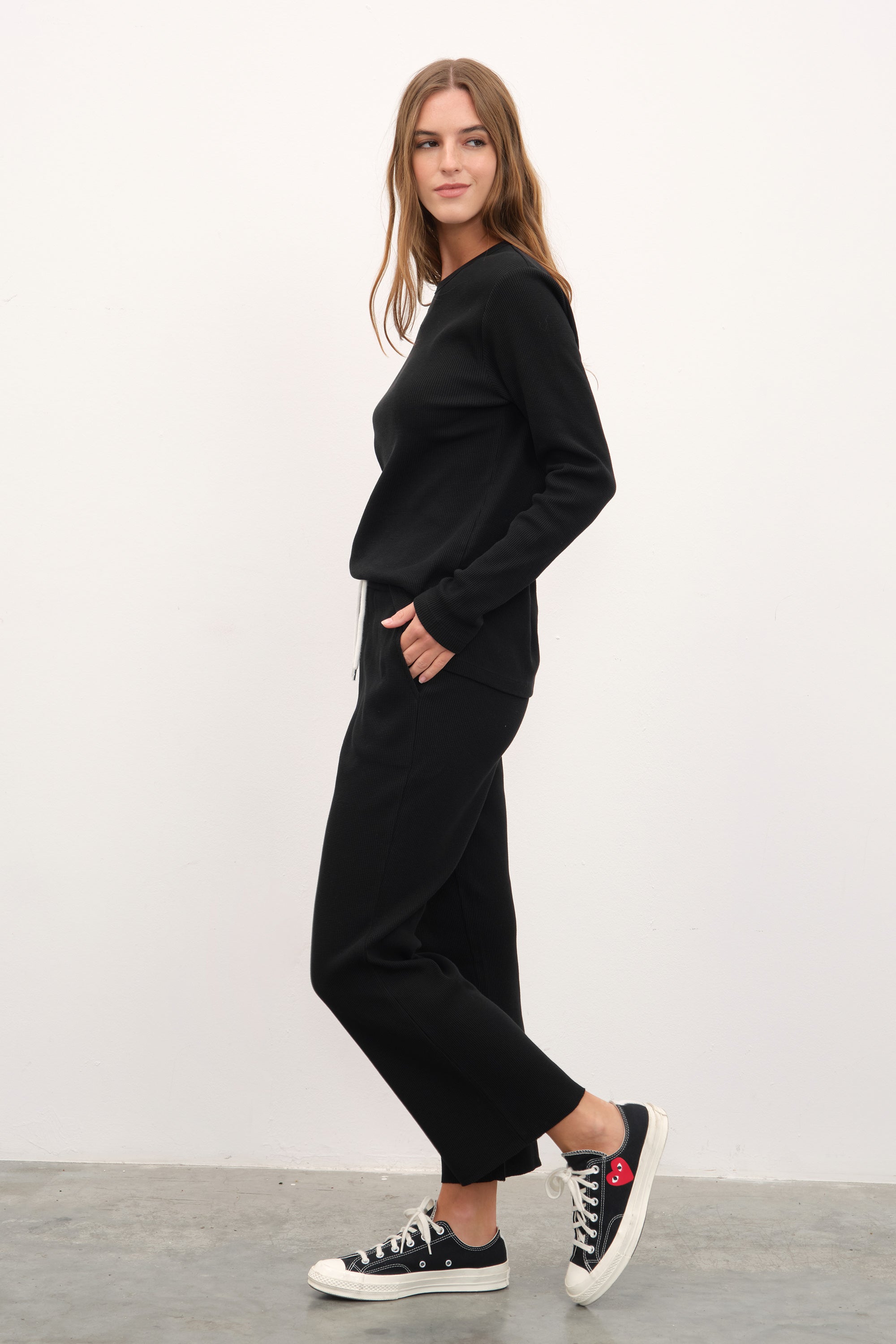 Signature waffle örgülü pamuklu kumaşımızdan, yanları cepli, diz altından itibaren bollaşarak bilek üstünde biten, crop flare eşofman altı.