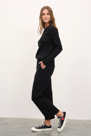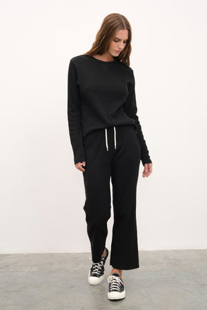 Ana görseldeki waffle cotton crop flare eşofman altı, waffle cotton uzun kollu unisex t-shirt ile tamamlanmıştır.