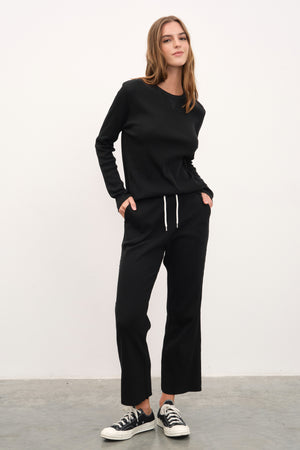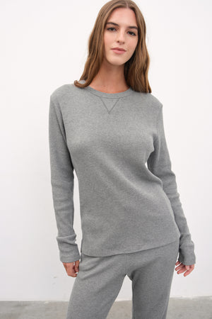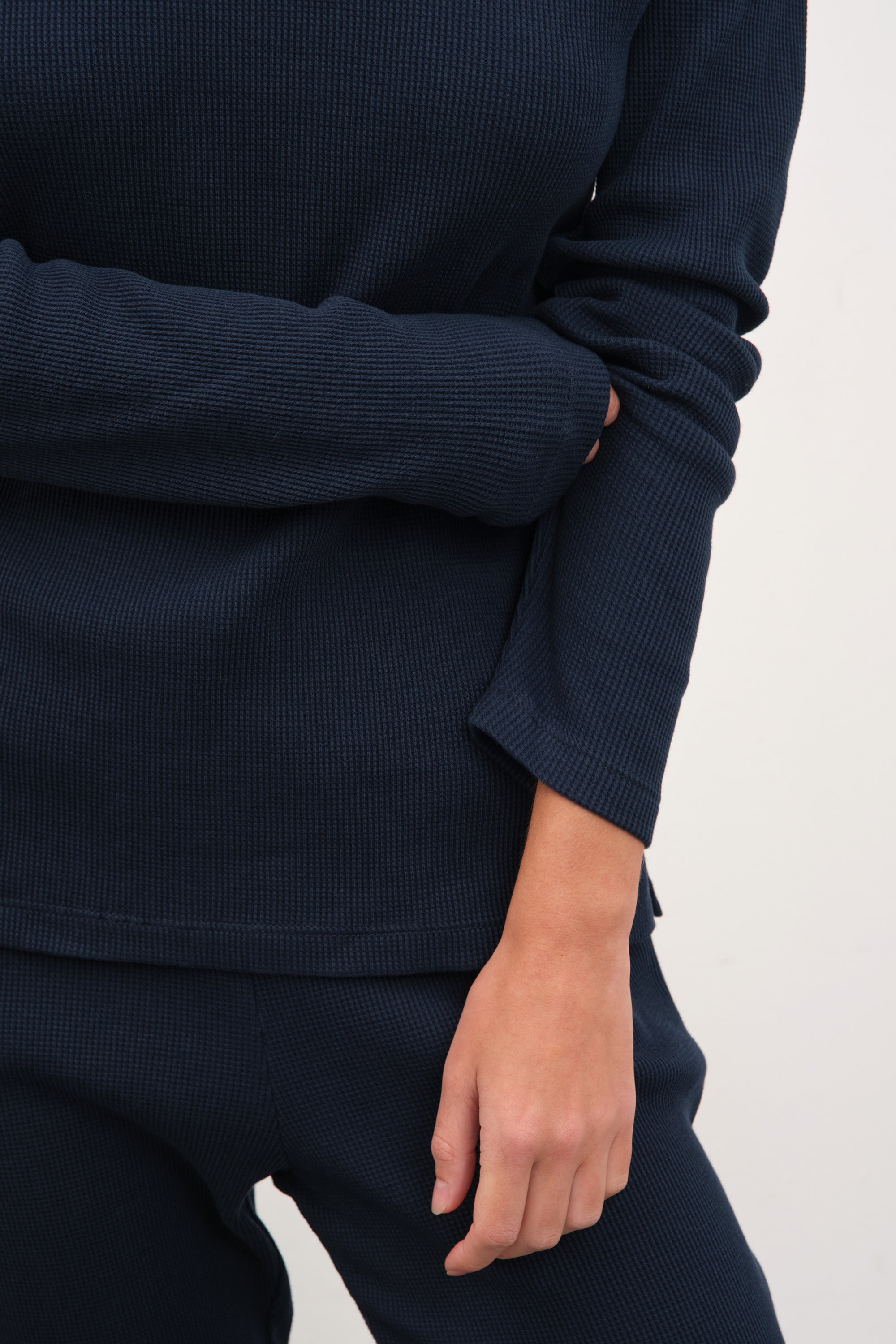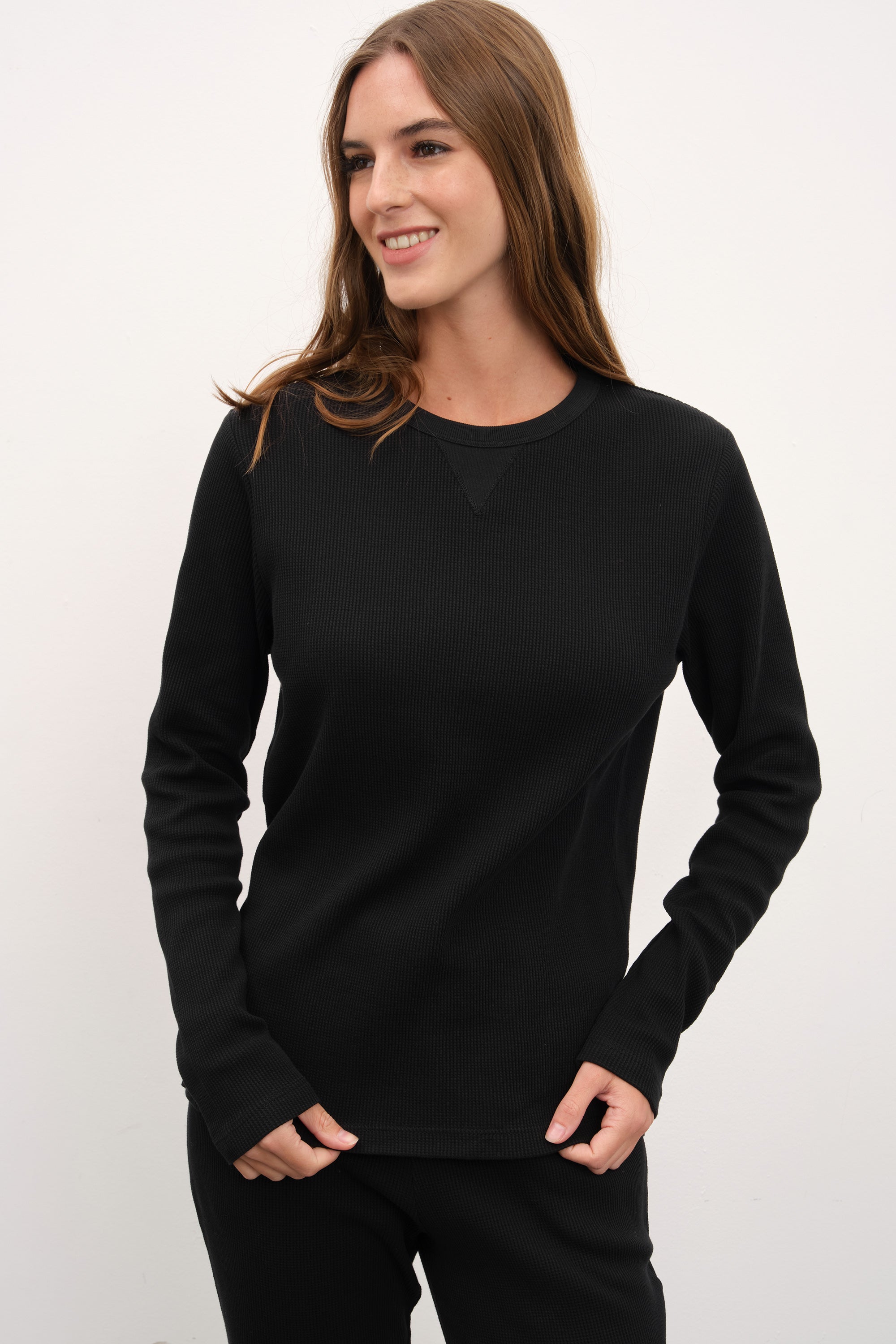 Ana görseldeki waffle cotton uzun kollu unisex t-shirt, waffle cotton crop flare eşofman altı ile tamamlanmıştır.